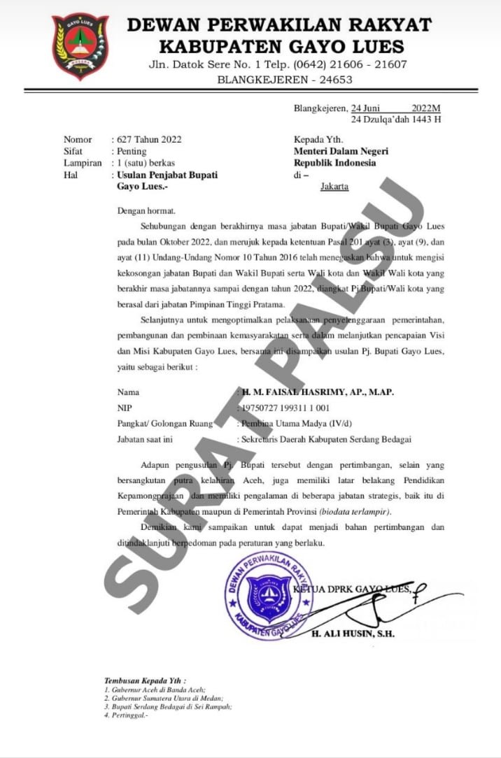 Seperti diketahui, dalam surat usulan tersebut, tertulis satu nama sebagai calon penjabat Bupati Gayo Lues yakni H Muhammad Faisyal Hasrymi AP M.AP yang saat ini menjabat sebagai Sekretaris Daerah Serdang Bedagai-Sumut.