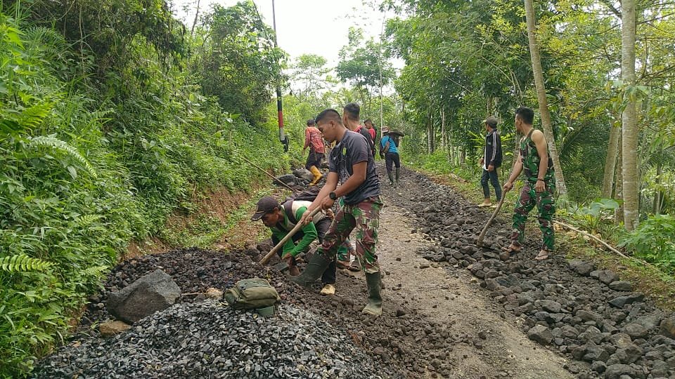 TASIKMALAYA, JAWA BARAT – Anggota Satgas TMMD ke 115 kodim Tasikmalaya yakni anggota TNI dan masyarakat sekitar melaksanakan Pengaspalan jalan desa tepatnya di Kampung Panyairan, Desa Cikadongdong Kecamatan Bojongasih pada Kamis, (13/10/2022).