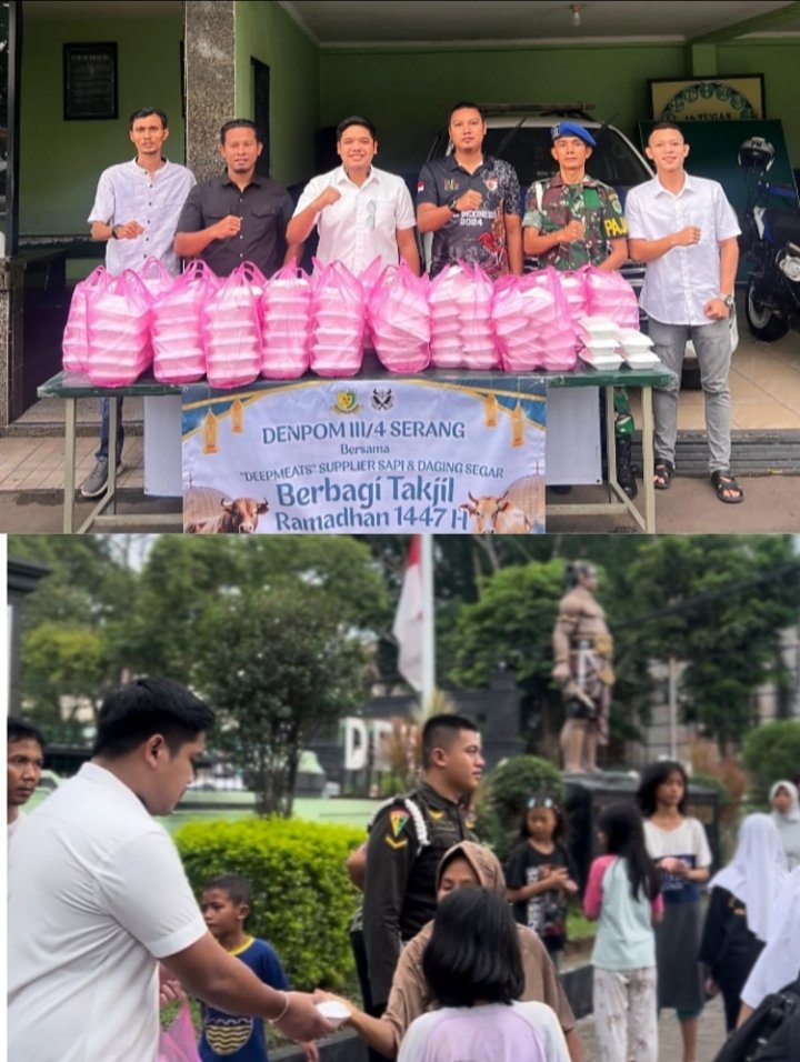 SERANG – Denpom III/4 Serang bekerja sama dengan supplier sapi dan daging segar DEEPMEATS menggelar kegiatan pembagian takjil gratis kepada warga masyarakat dan pengguna jalan pada bulan suci Ramadan 1447 Hijriah. Kegiatan berlangsung pada Rabu (04/03/2026) pukul 16.30 WIB hingga pukul 17.30 WIB di halaman Markas Komando (Mako) Denpom III/4 Serang.