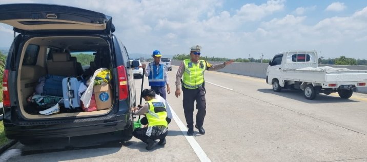 Tim Urai Sat Lantas Polres Kendal Sigap Bantu Pemudik Yang Alami Pecah Ban di Tol KM 400