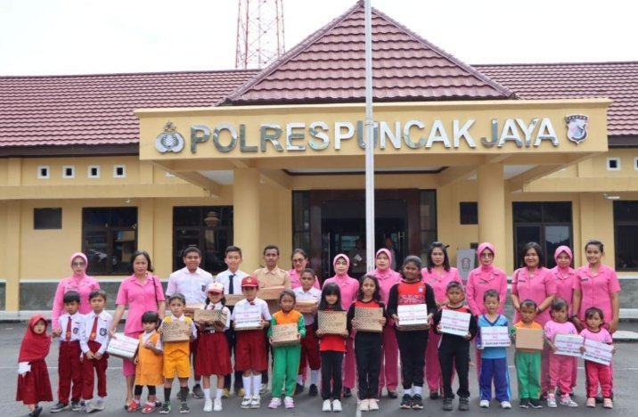 Bhayangkari Cabang Puncak Jaya Bagikan Puluhan Pasang Sepatu Kepada Anak-Anak Sekolah Di Puncak Jaya